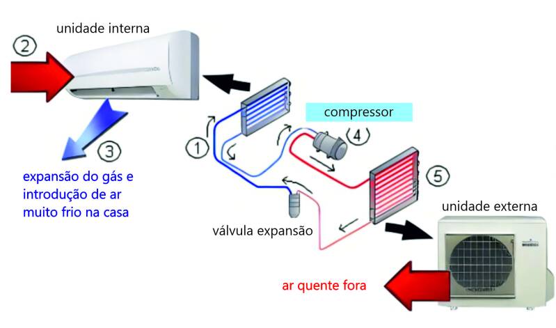 conforme descrito na figura , no ciclo de resfriamento do ar condicionado, o refrigerante que chega da unidade externa torna-se gasoso e o forte frio criado com expansão e condensação é distribuído, da unidade interna, para dentro da casa, com efeitos muitas vezes adversos sobre saúde