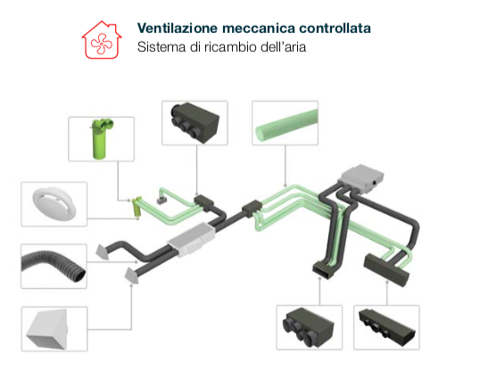 A troca de ar na casa com um sistema VMC ROSSATO é projetado para desumidificar e reciprocar, recuperando até o 95% da energia do ar espulso, cedendo-o ao ar de renovação de entrada.